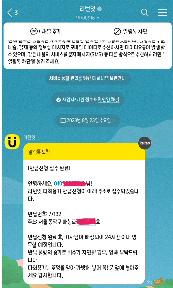 시작하기 누르고 간단히 회원가입하면 (비회원도 가능, BUT 회원가입시 주소 매번 입력 안해도 되어요) 바로 10초만에 수거요청이 완료되어요. 친절하게 수거접수가 완료되면 카톡으로 알림톡도 온답니다. 참 쉽죠잉?